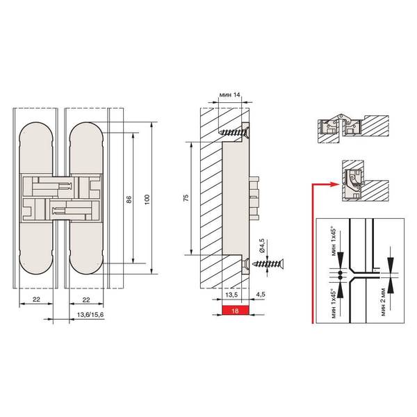 Главной особенностью представленных петель является то, что при закрытой двери они невидимы. Все петли универсальны и подходят как для дверей с правым, так и с левым открыванием. благодаря особой конструкции шарнира есть возможность регулировки в трех направлениях без демонтажа.